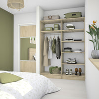 Ce dressing Chêne blond de 2 espaces est composé d´1 tringle (penderie longue pour robes, manteaux, etc.) et de 5 étagères (idéales pour les vêtements pliés). Grâce à son décor chaleureux intemporel, il s'harmonise à tous les styles déco !