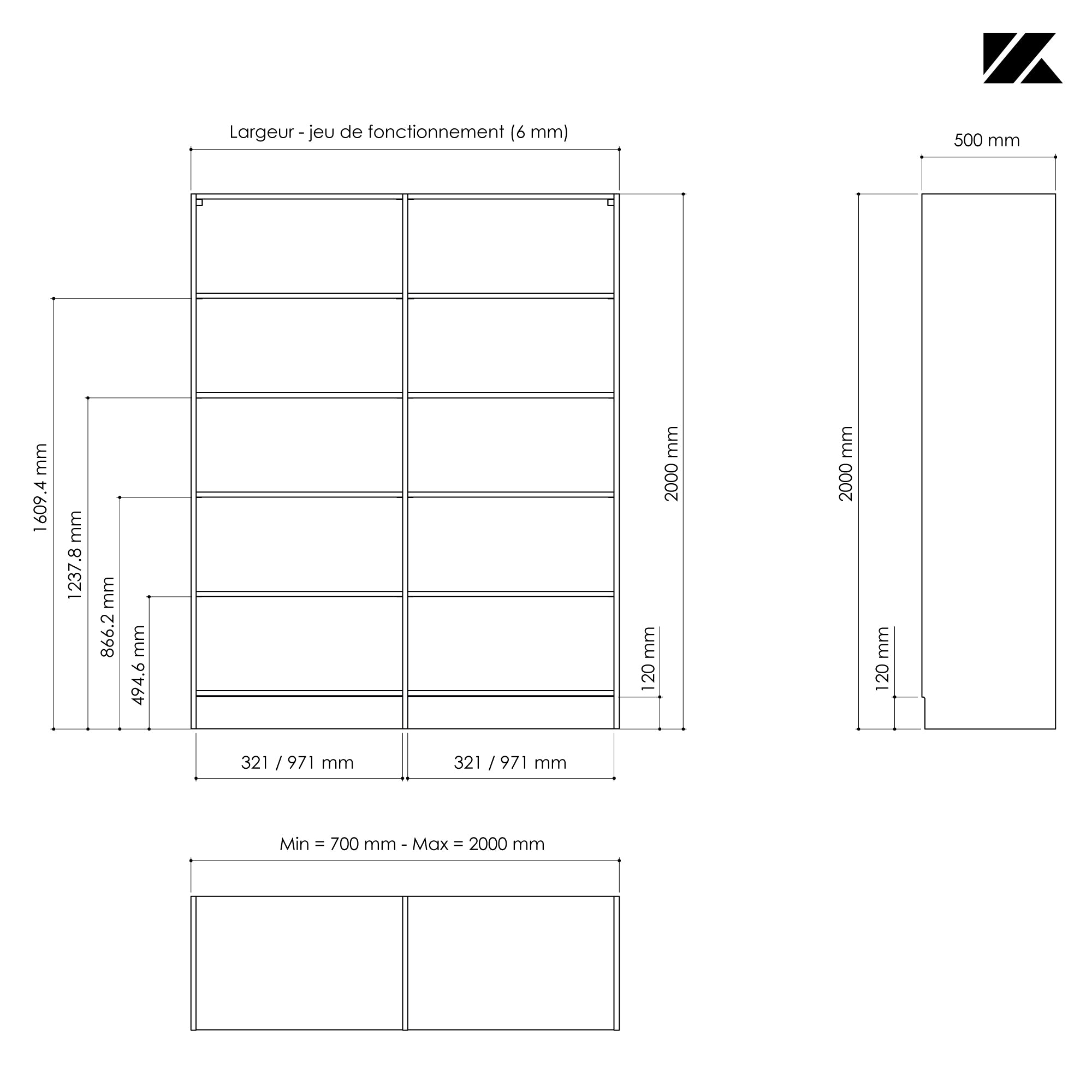Fonctionnel et pratique, il se met à vos dimensions en largeur pour répondre à tous vos besoins. Sa hauteur est fixe. Grâce à sa profondeur fixe de 500 mm, il est idéal pour s´intégrer dans une niche. Cela lui permet aussi d'être parfaitement compatible avec toutes les façades de placard Kazed, quelque soit le système d'ouverture : pivotant, coulissant ou pliant.