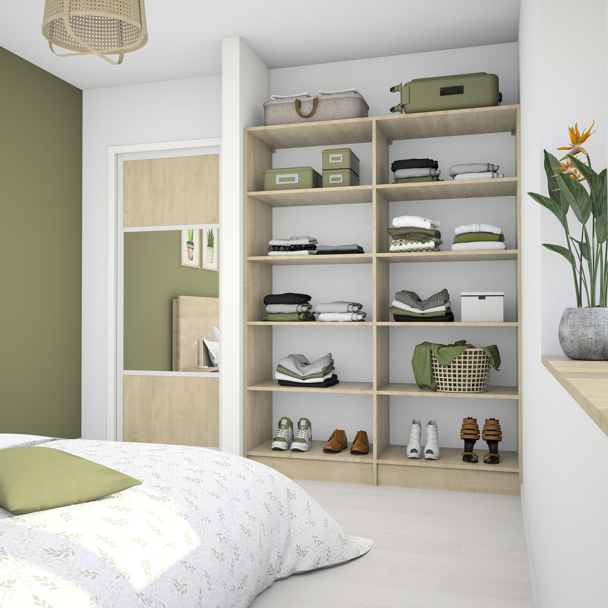 Ce dressing Chêne blond de 2 espaces est composé de 8 étagères (idéales pour les vêtements pliés). Grâce à son décor chaleureux intemporel, il s'harmonise à tous les styles déco !