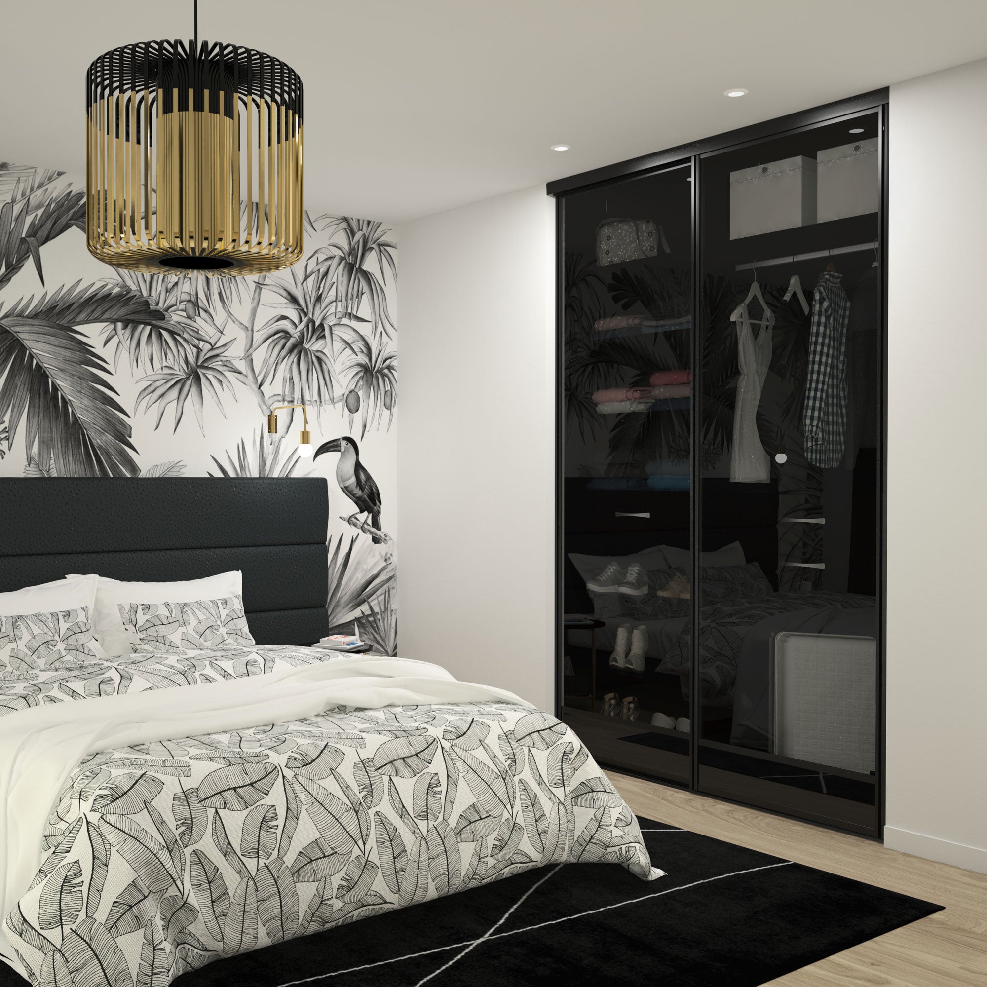 Si vous aimez la transparence mais préférez garder un peu d'intimité, misez sur cette façade de placard coulissantes tout en vitre Grisée. Une fine frise basse en verre laqué Noir et sa finition en alu Noir mat soulignent avec élégance ces portes, pour une déco digne des magazines.