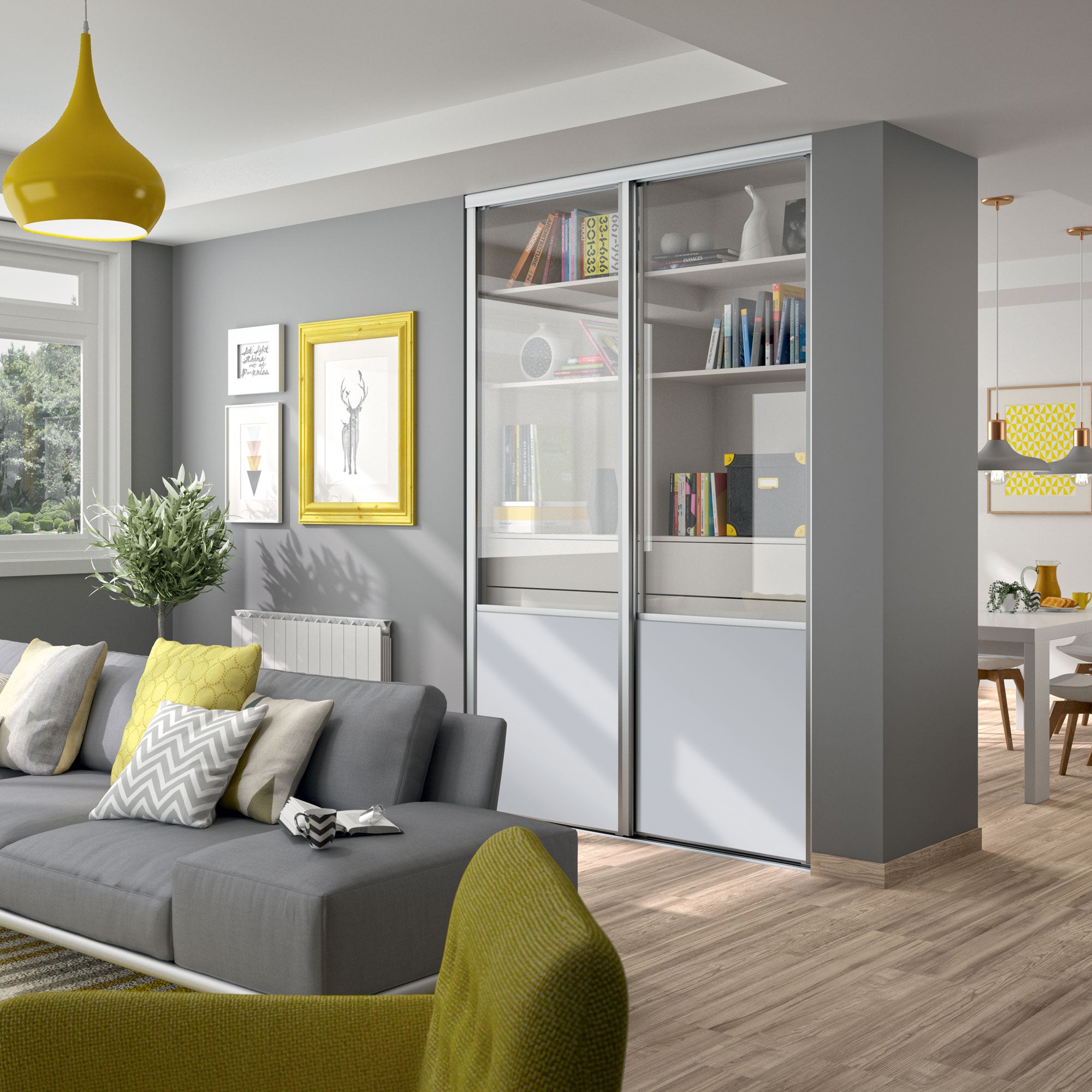 Mixez une vitre claire à un décor gris galet, et vous obtenez une porte de placard haut de gamme idéale pour votre salon ou votre bureau. La structure en aluminium renforce l'effet luxueux.