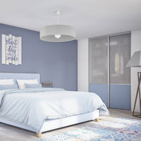 Cette façade de placard coulissante protégera l'intimité de votre dressing grâce à leurs vitres dépolies. La touche de modernité de son bleu gris et ses finitions en aluminium vous plongeront dans l'océan.