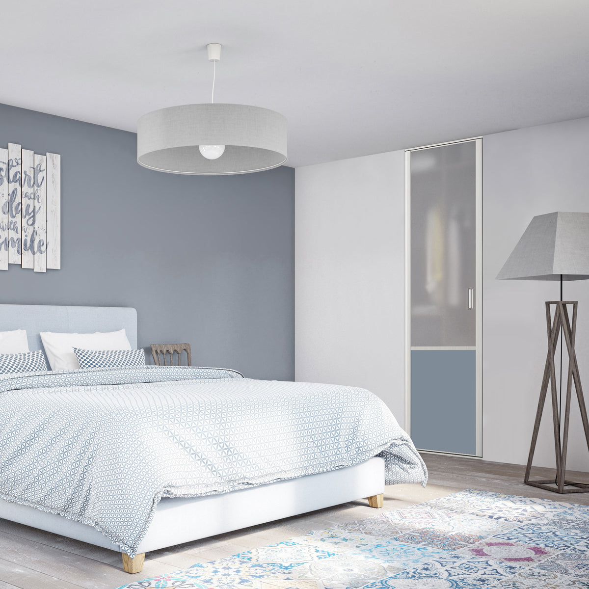 Une porte de placard pour vous emmener sur la côte ! Assemblés sur une structure en aluminum, son bleu gris et sa vitre dépolie offrent un rendu apaisant et moderne.