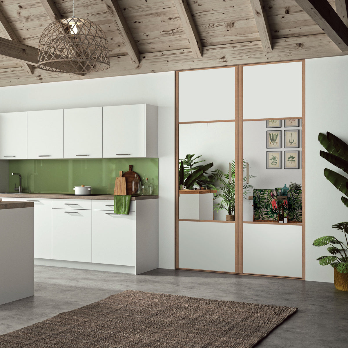 Vous allez adorer ces portes de placard pivotantes ! En associant le Blanc mat et le miroir Argent, elles apportent de la luminosité et de l’élégance à votre pièce. Le Merisier romana de la finition apportera quant à lui de la chaleur et de l´authenticité.