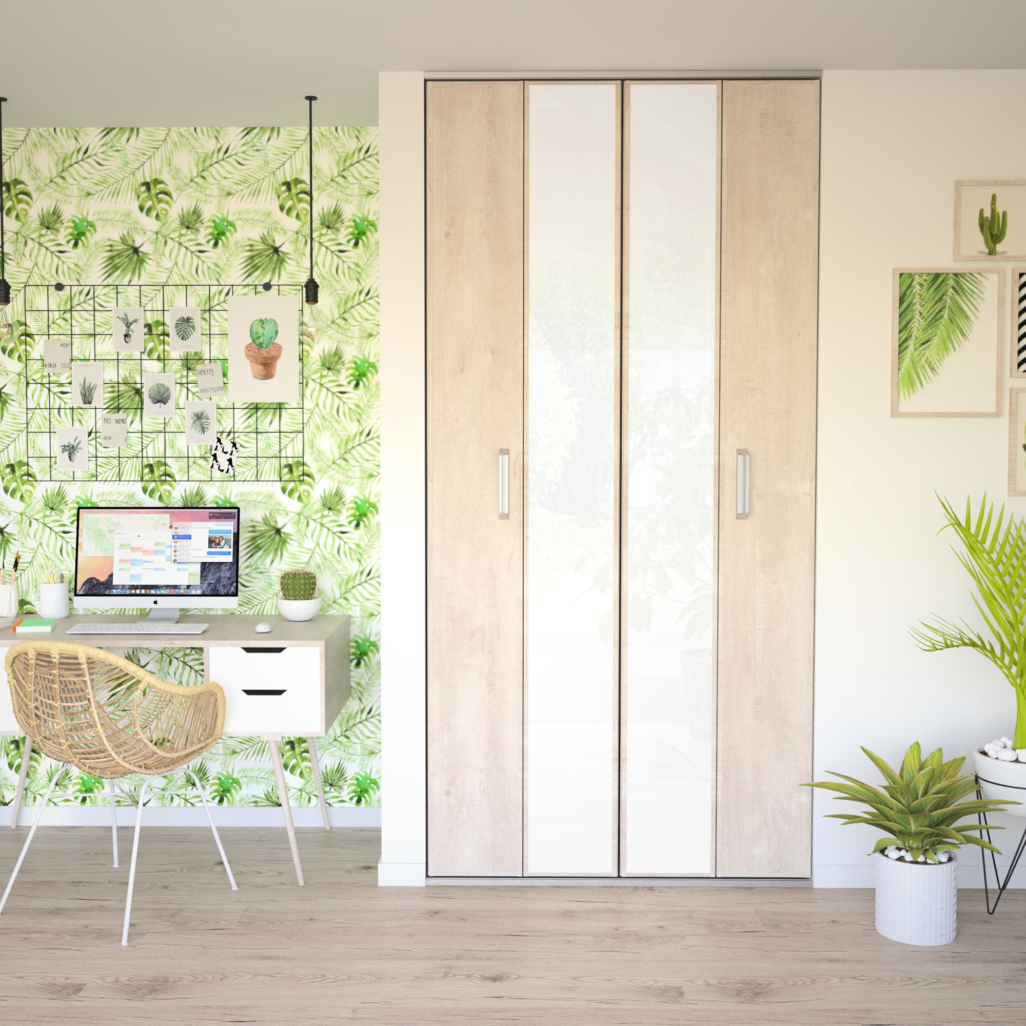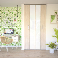Les deux portes pliantes de cette façade de placard sont soutenues par une jolie structure en aluminium haut de gamme. Le verre laqué blanc pur illumine un décor effet chêne flanelle brut.