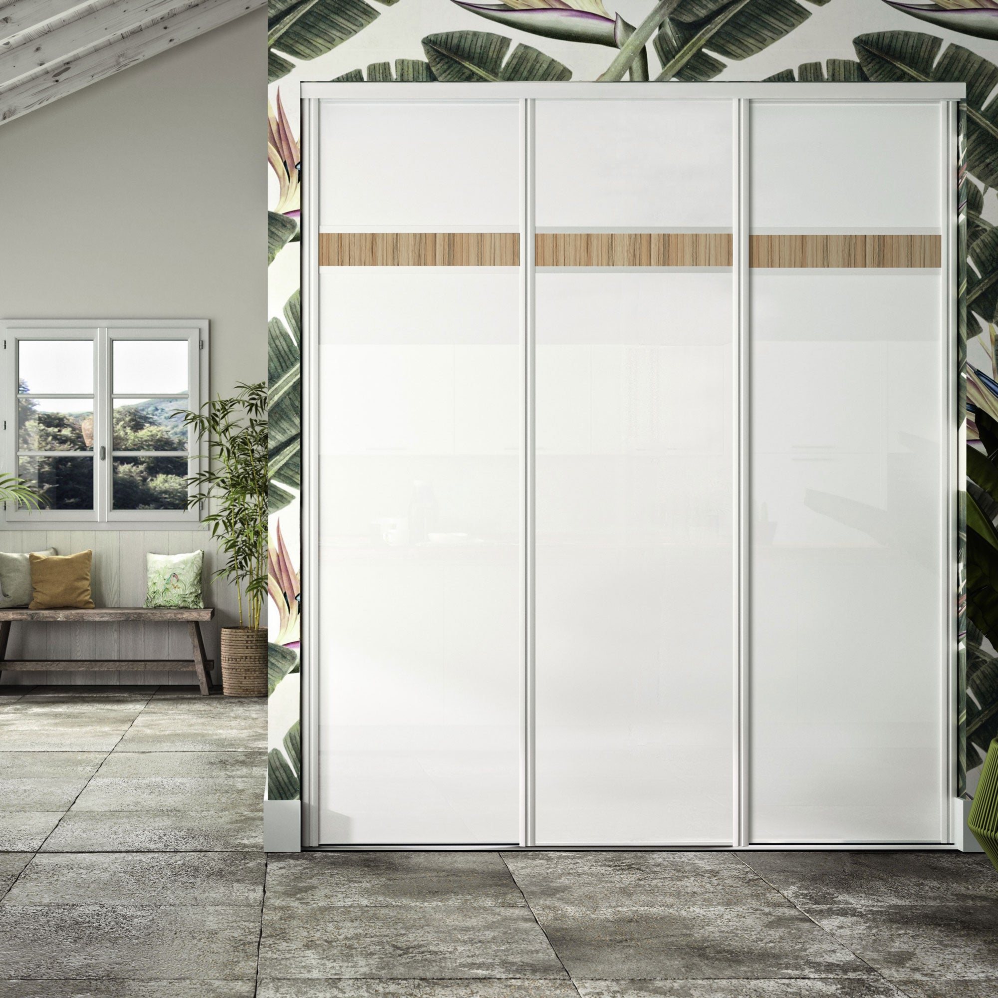 On adore la composition graphique de ces portes de placard coulissantes qui mélange un verre laqué Blanc pur brillant et lumineux à une fine frise de Panama, un décor bois exotique qui lui donne tout son caractère. Sa finition Blanc mat souligne en toute discrétion cette composition. Cette façade nous transporte directement sous les tropiques.