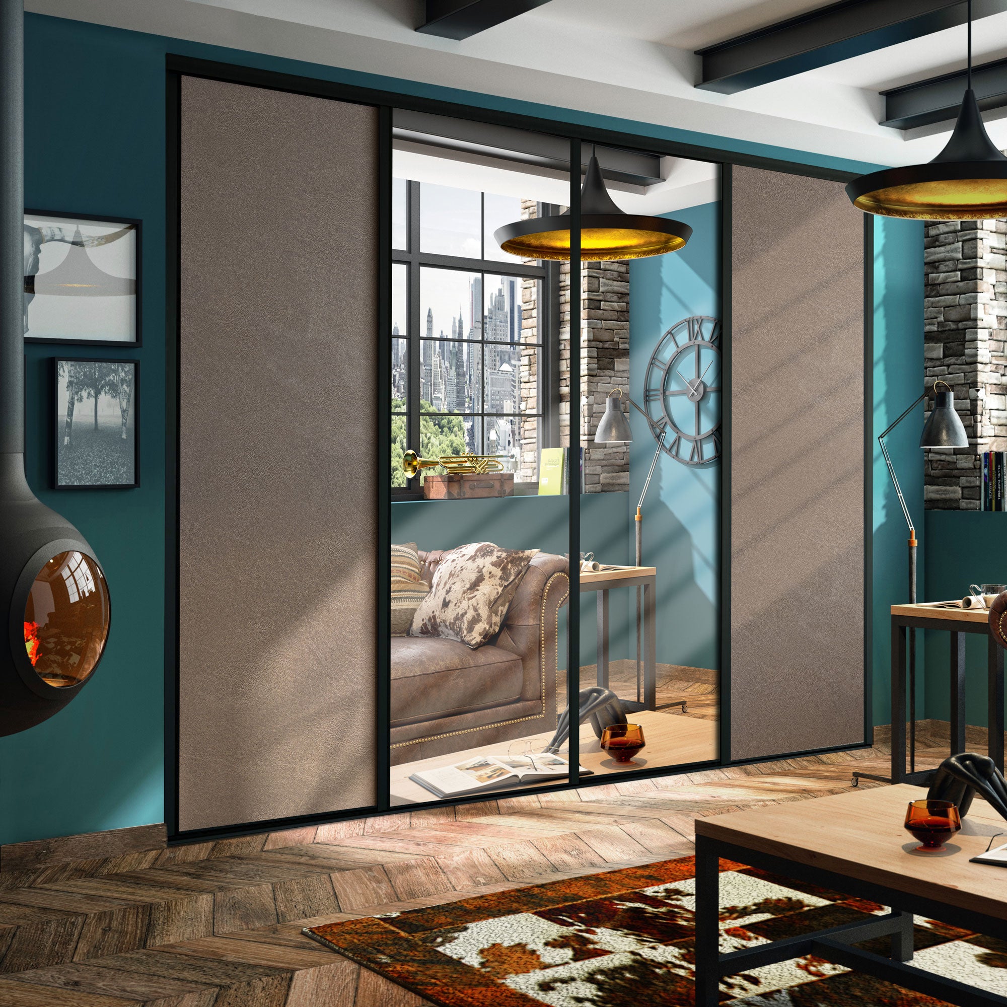 Ce mélange parfait entre la douceur d'un effet cuir vintage beige et la luminosite d'un miroir argent apportera un cachet vintage à votre décoration. Ces 4 portes coulissantes de placard possèdent des finitions en aluminium noir mat.