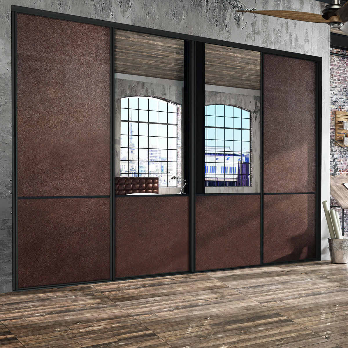 Le mélange harmonieux et chic de cette façade de placard coulissante sera parfait pour une chambre vintage ! Le miroir argent est mis en valeur par un décor cuir vintage brun doux et chaleureux. La structure en aluminium noir mat vous garantit un produit haut de gamme et élégant.