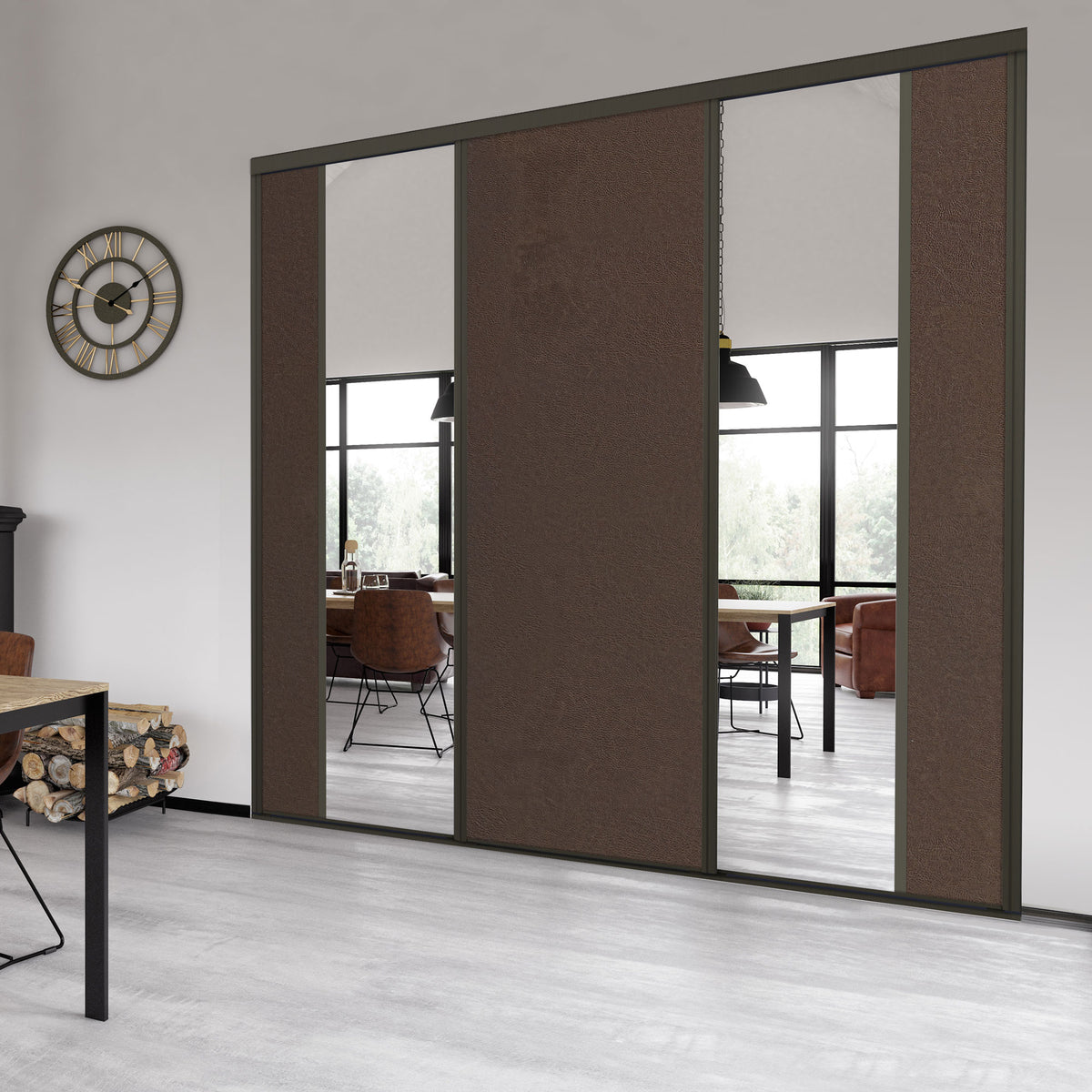 Craquez pour cette collection de façades de placard vintages qui apporte luminosité et caractère à votre intérieur. Le décor cuir vintage brun et le miroir argent de ces portes coulissantes offrent un rendu élégant et haut de gamme. Les finitions sont en aluminium effet inox brossé.