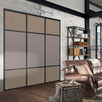 Pour une ambiance chaleureuse et apaisante, ces 3 portes de placard coulissantes allient l'effet cuir vintage beige et le coloris moka. Élégantes et modernes, elles sont mises en valeur par des finitions en aluminium noir mat.