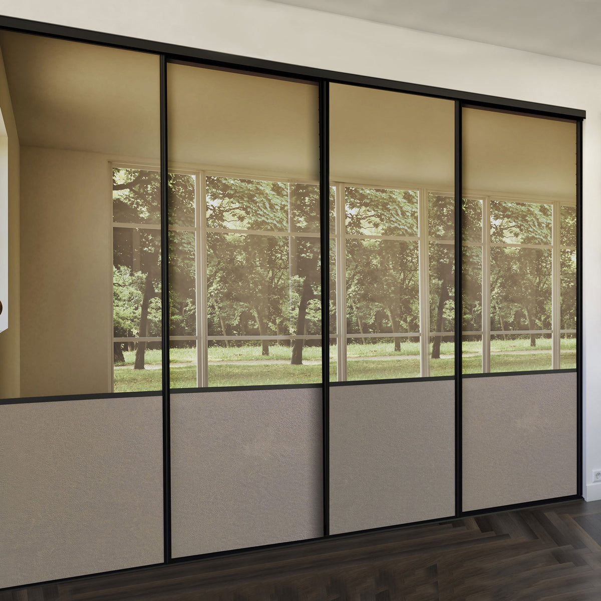 Cette façade de placard coulissante est extrêmement tendance et chic de part son miroir bronze que les finitions en aluminium noir mat font ressortir à merveille. L'effet cuir vintage beige épouse quant à lui parfaitement l'ensemble pour 4 portes très contemporaines.