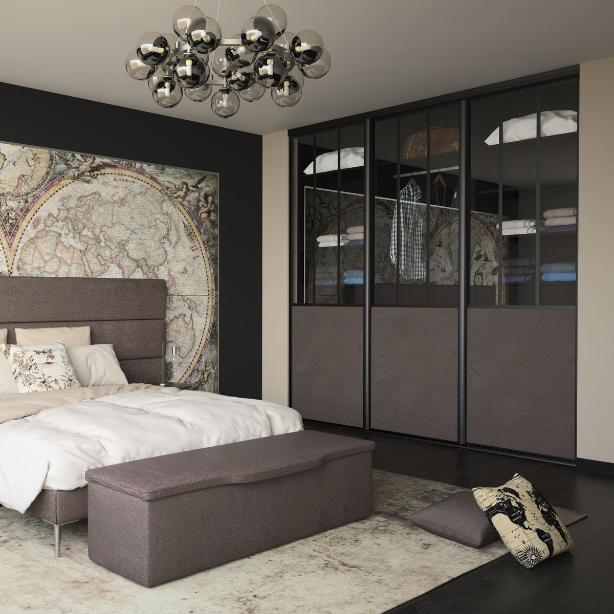 Cette façade de placard coulissante est composée d’un effet Cuir Vintage Brun surplombé d’une Vitre Claire à l’allure d’une verrière. La structure en aluminium Noir Mat s’accorde parfaitement au style atelier revisité dans une tendance vintage.